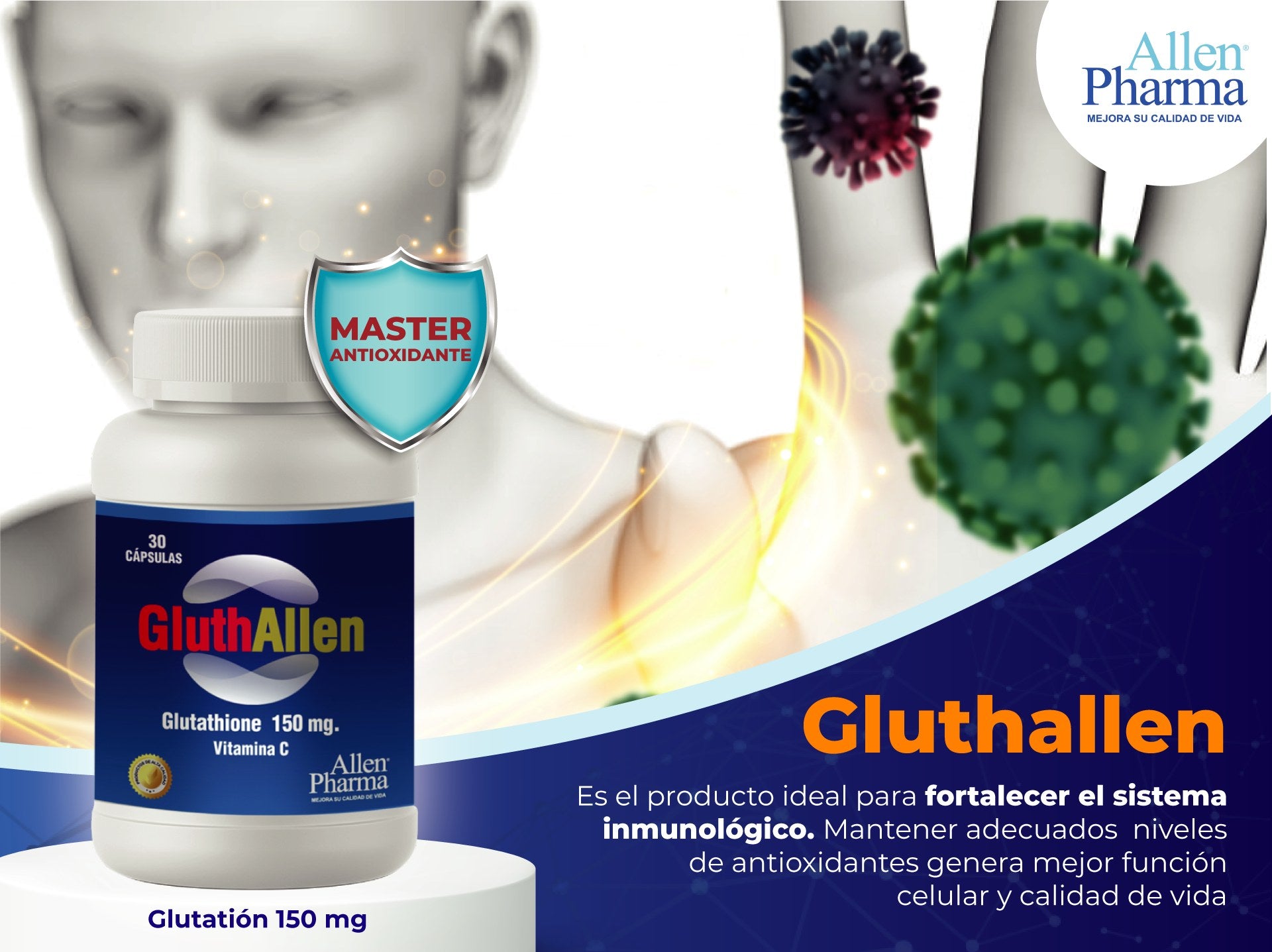 Es el antioxidante más poderoso del cuerpo, se le llama el antioxidante maestro por su poder, ayuda a destruir los radicales libres producto del metabolismo, los cuales destruyen células sanas y aceleran el envejecimiento por oxidación en forma desproporcionada.